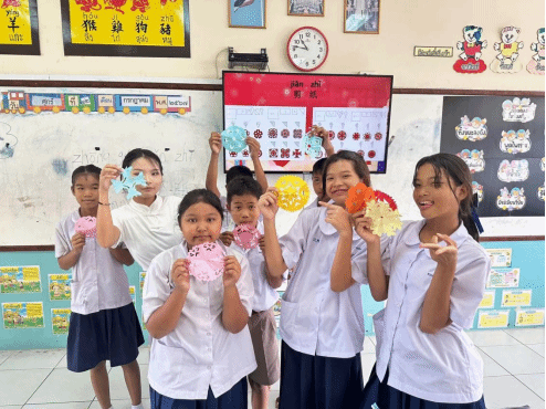 在Chonprathanwittaya学校,沈钰婷和冯柏琳给高三的学生展示了精美的立体“春”字剪纸,并详细讲解了如何通过六折法和八折法来完成作品。学生们很快就掌握了要领,纷纷动手尝试。当一个个立体的“春”字从他们的指尖诞生时,满满的成就感便油然而生。随后,学生们还尝试了更多创意性的剪纸图案,每一件作品都是独一无二的艺术品,孩子们的脸上洋溢着自豪和喜悦。
