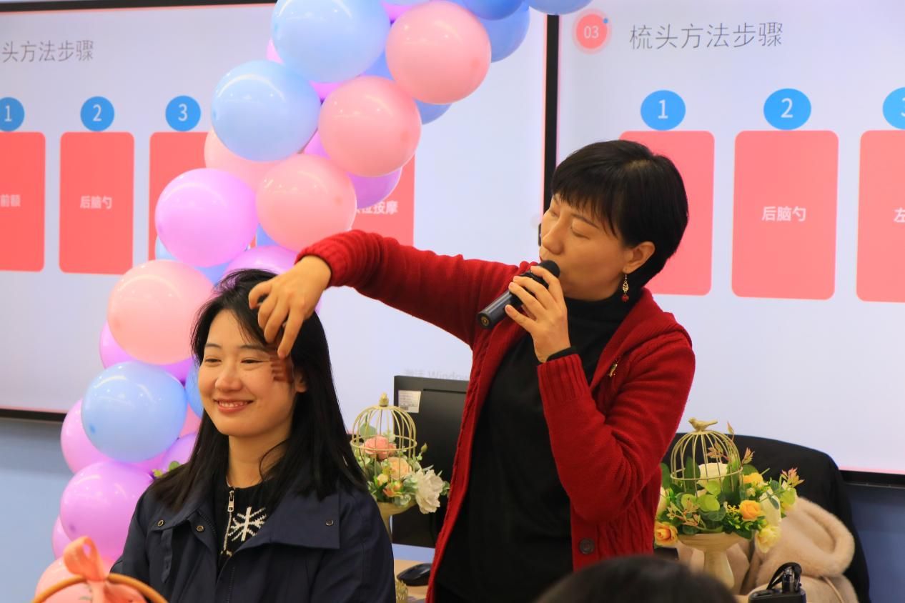 除了插花活动,活动现场还设置了头皮护理养生课堂,主要针对常见的头皮问题分享科学的梳头方法和穴位按摩技巧。活动还设置了互动与分享环节,女教职工们积极交流活动感受,分享自己在插花和养生方面的心得。