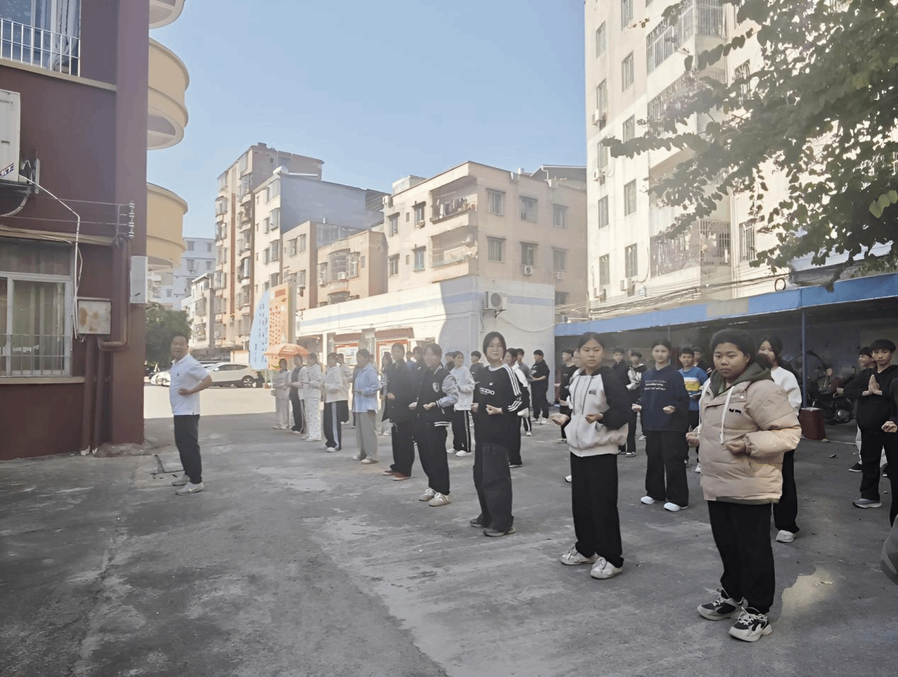 在浸潭镇第一初级中学,课程开始前,陈维泽嘱咐同学们,学习武术的根本目的在于强身健体,培养坚韧不拔的意志力和自律精神,他特别指出,“学武先习德”,提醒学生们在追求武术技能提升的同时,更要注重品德修养的培养,学会尊重他人、珍视友谊、秉持正义。随后,张彪老师为学生们示范了一套经典武术组合动作,随着50名青少年齐声喊出“功夫拳”,他们随即投入到认真的演练之中,操场上顿时弥漫起浓厚的武术练习氛围,现场秩序井然,活力四溢。