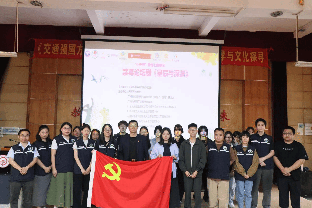 3月27日下午,一场别开生面的禁毒心理剧《星辰与深渊》在广东交通职业技术学院国际校区学术报告厅精彩上演。本次活动由广州市天河区禁毒办指导,比音勒芬·儿童青少年安心驿站、天河区外市籍人员禁毒社工项目、龙洞街禁毒办、番禺区启悟社会工作服务中心、广东交通职业技术学院安全保卫处及教育与艺术学院联合主办,并由教育与艺术学院学子倾情参演。教育与艺术学院党委委员、学生科科长李志立,各辅导员、120余名中高职学生共同参与活动。