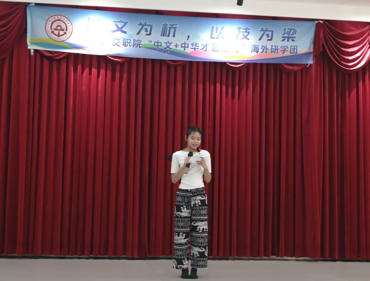 熊嘉逸代表学院致辞,高度评价了营员们在我院研学期间的学习态度和学习成效,对教育与艺术学院办营工作表示肯定,并属望营员们将本次研学收获讲给家人们听,成为中泰文化交流的友好使者。