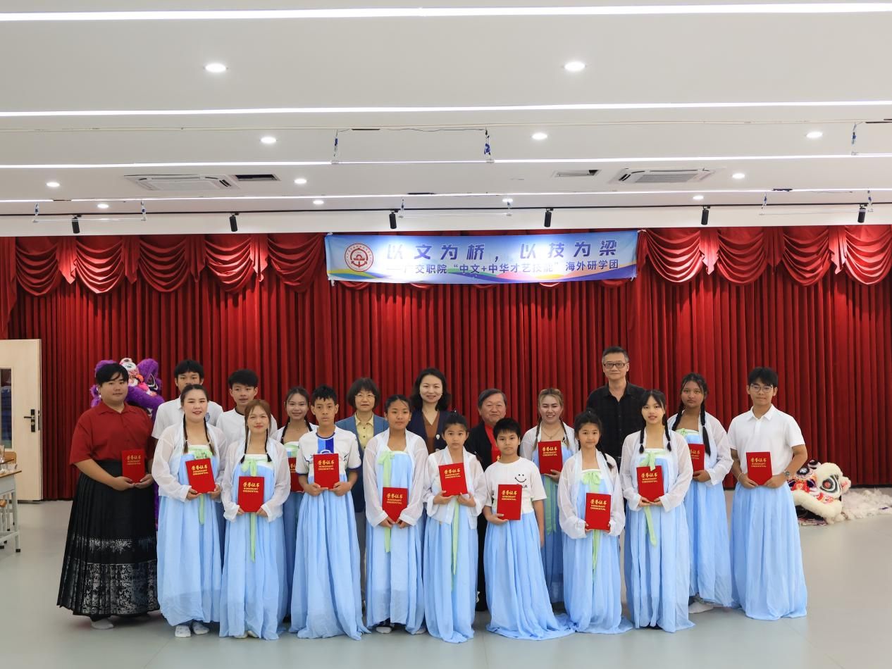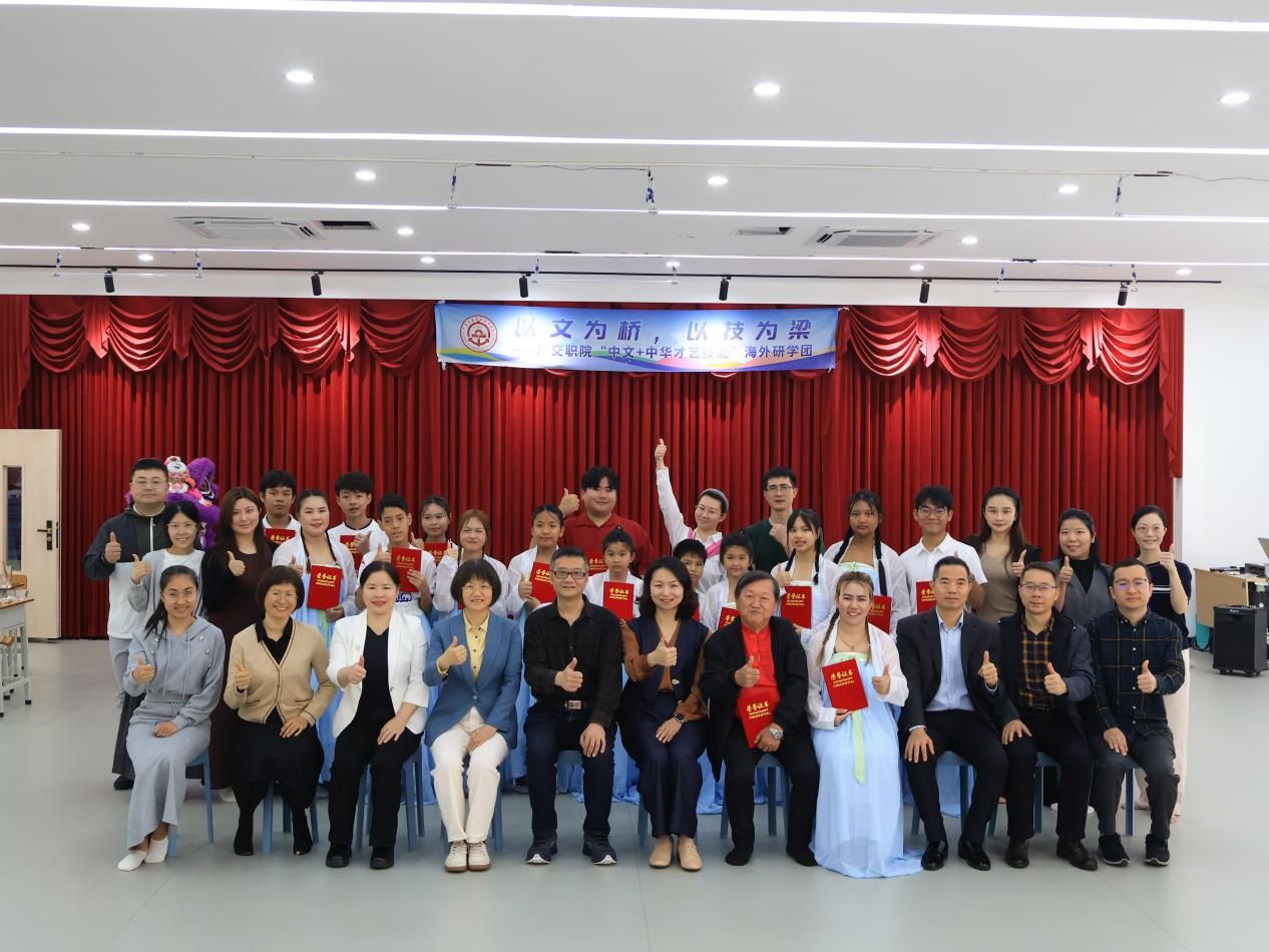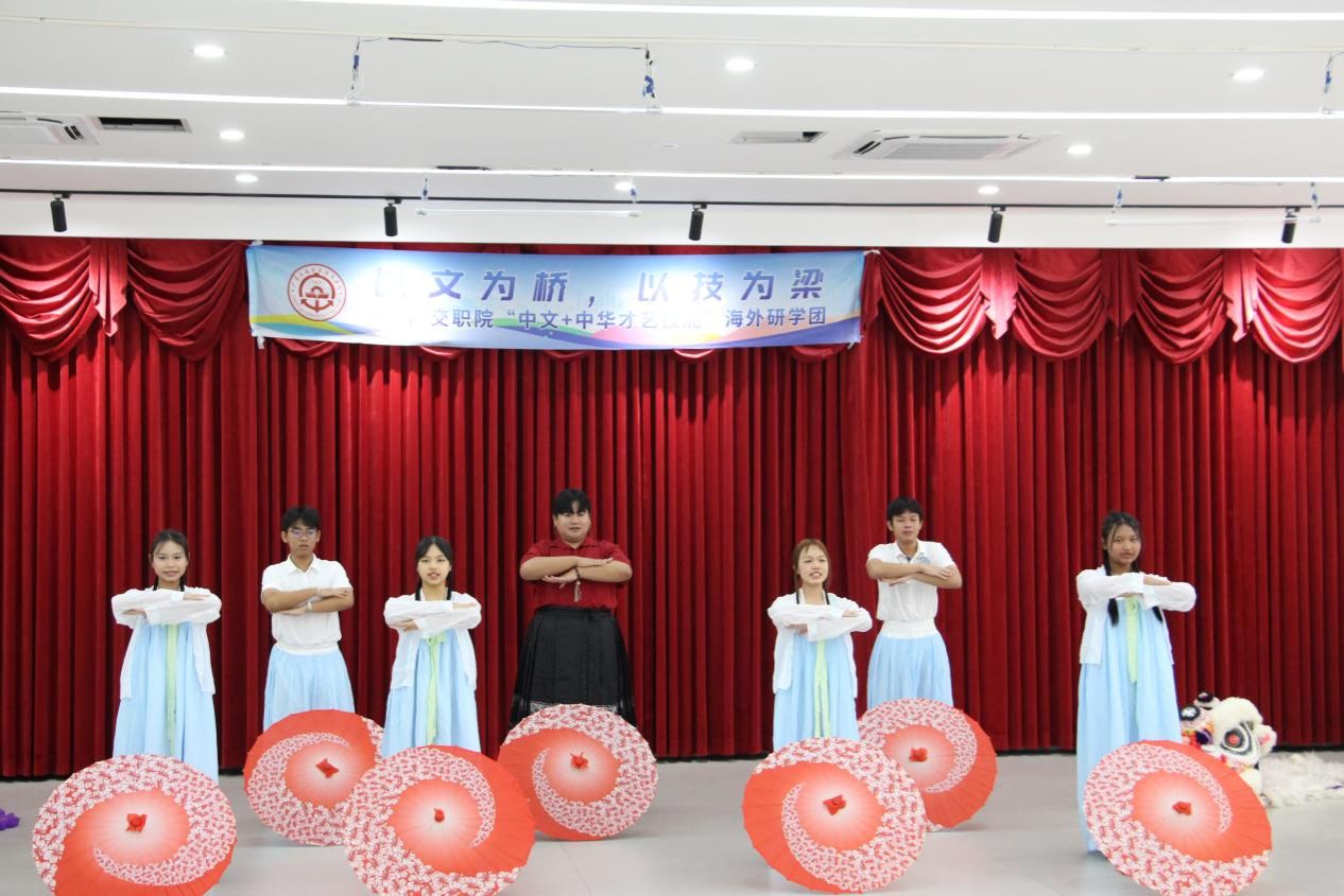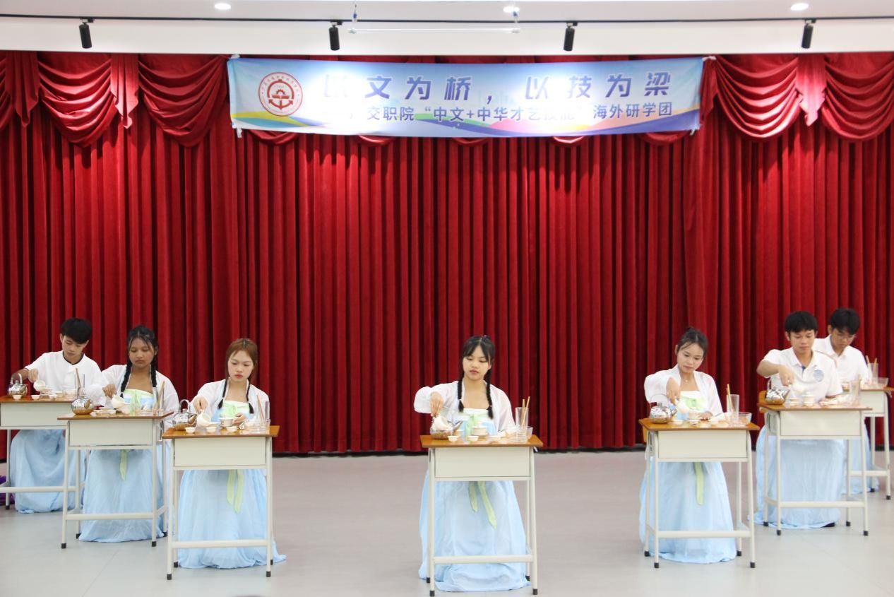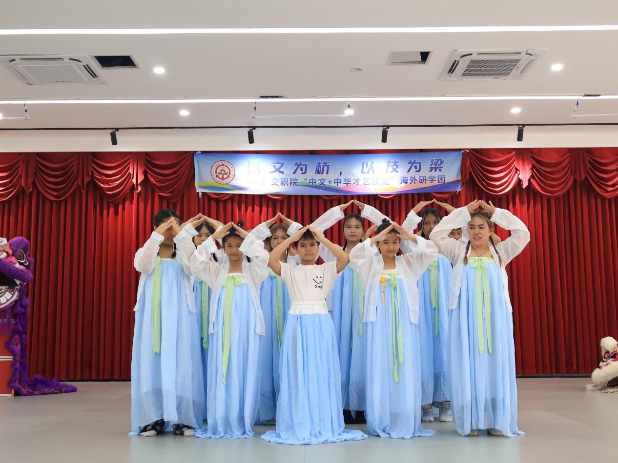 4月9日上午,2025年“中文+中华才艺技能”项目——泰国学生来华研学营在学院国际校区举行“魅力中文·岭南技艺·粤韵茶香·诗韵传情”主题结营汇报演出,广东交通职业技术学院副院长熊嘉逸,学院港澳台和国际交流合作处、继续教育学院、科技产教园区相关负责人,教育与艺术学院领导、师生以及来自泰国的师生营员共计70余人参加。