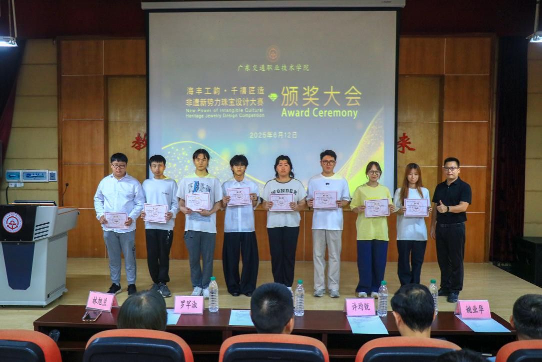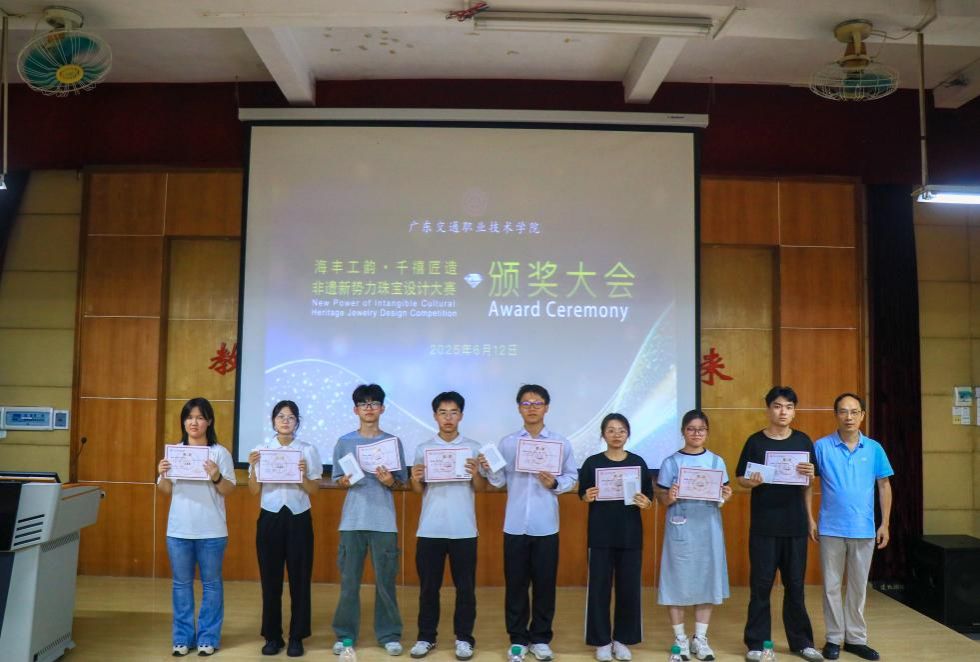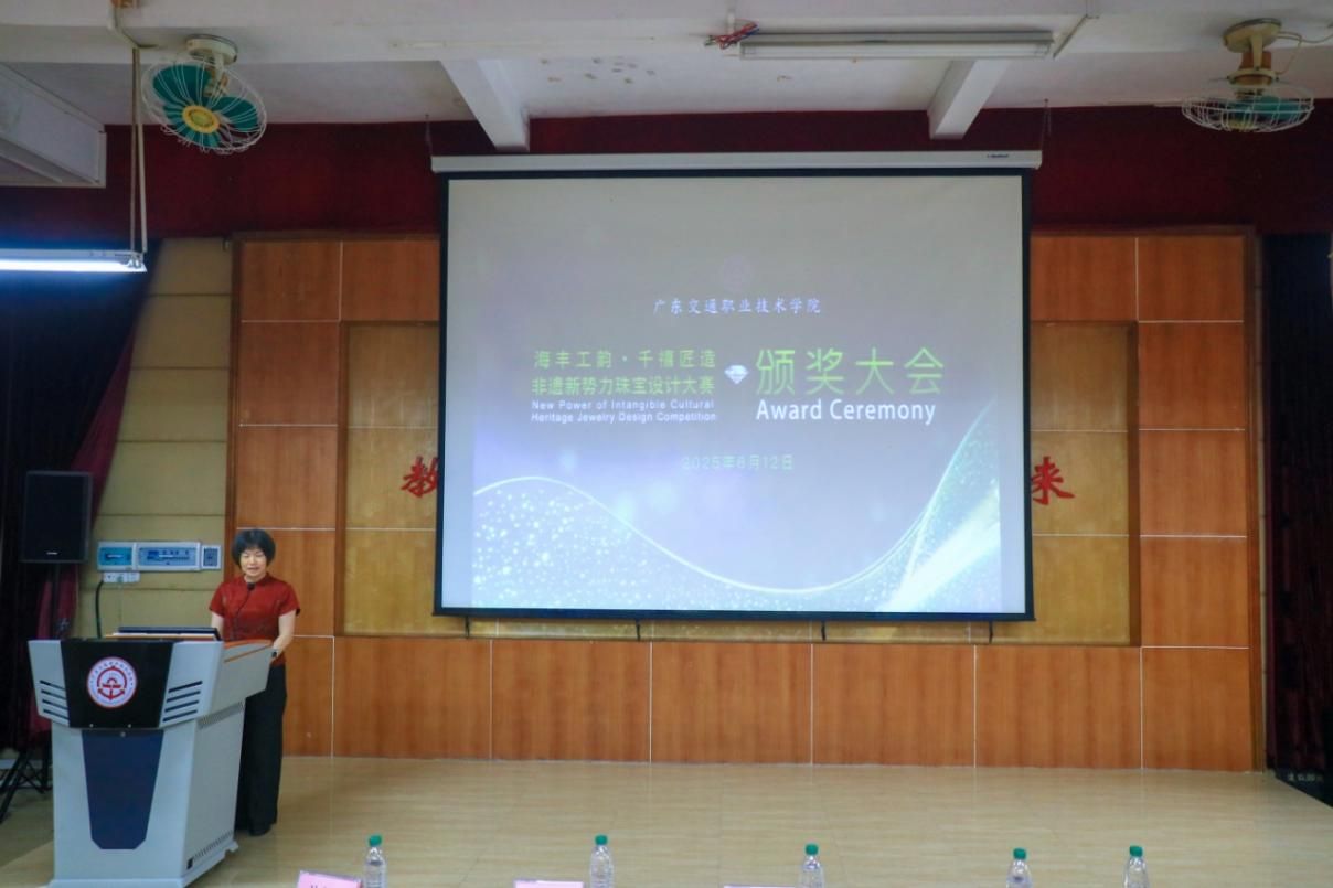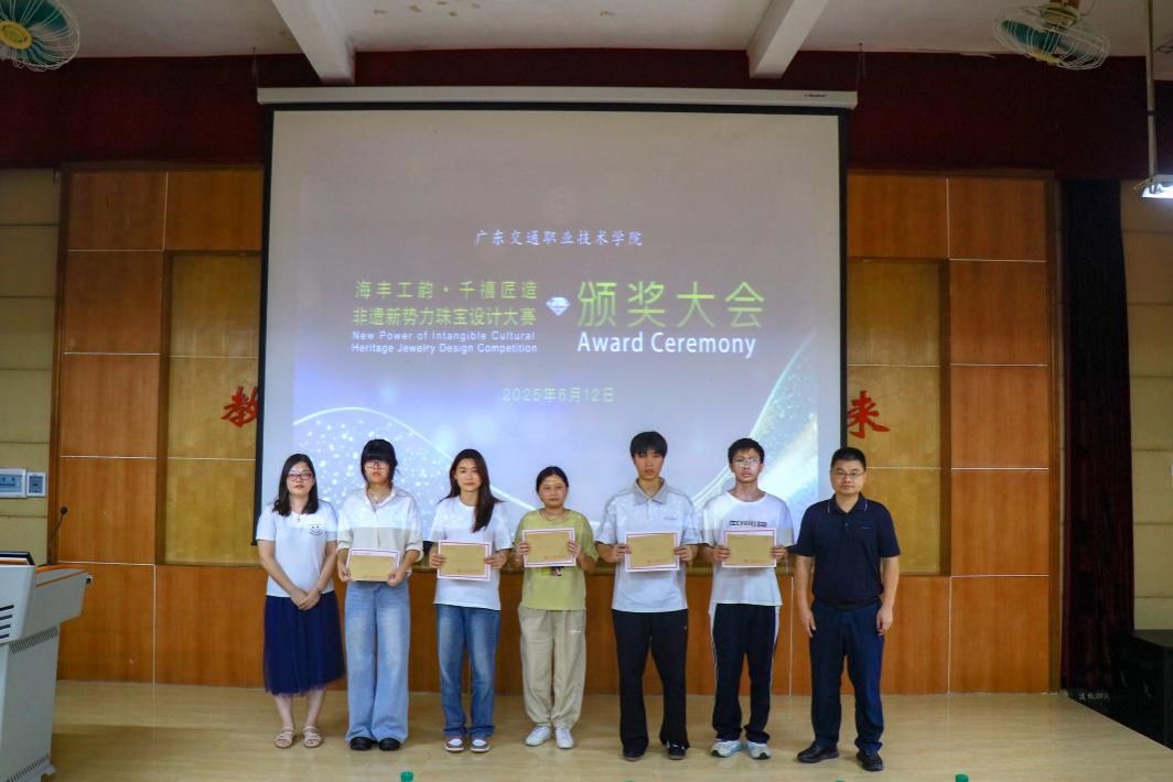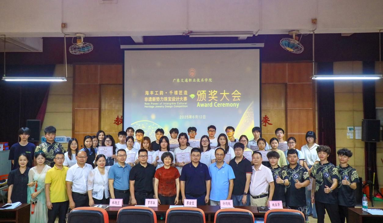 2025年6月12日,广东交通职业技术学院在国际校区学术报告厅举办“海丰工韵·千禧匠造”非遗“新势力”珠宝设计大赛颁奖典礼。校党委副书记廖金宝,学工部副部长许均锐,组织部科长萧达钞,“双百行动”驻海丰县服务队副队长聂文锋,校团委教师李晓凤,教育与艺术学院院长罗罕淑、副院长姚业华、林旭兰等出席活动,与获奖学生共同庆祝57件设计作品获奖的荣誉时刻。