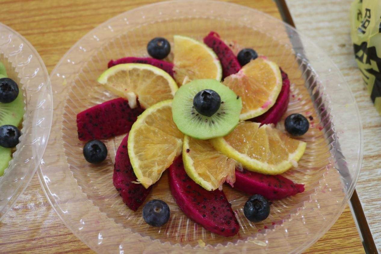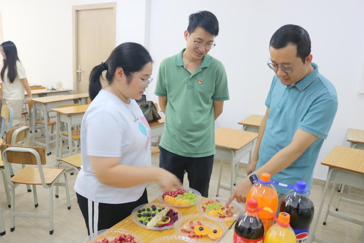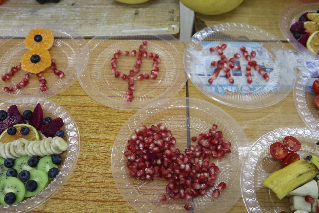 活动现场气氛热烈,同学们以小组为单位,利用火龙果、香蕉、葡萄、石榴、橘子等丰富水果,发挥专业特长与创意巧思,精心制作出一个个寓意深远的拼盘作品。有的小组以红石榴籽拼出“中秋节”字样和中国地图,表达对祖国的深切祝福;有的用苹果和黄瓜搭建出“幼儿园”场景,体现对未来职业的向往;还有小组拼出爱心图案和椰子树造型,展现青春的活力与多元的创意。