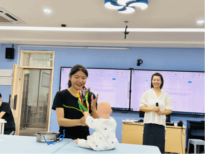 在课堂上,王老师充分利用婴幼儿运动发展的视频,有效吸引学生的注意力,激发他们的学习兴趣。同时,她还别出心裁地引导学生利用生活中的道具创作训练婴幼儿精细动作发展的教具,这一创新性的教学方法不仅极大地提高了学生的参与度,更让课堂氛围变得非常活跃。学生们所展示的作品充分体现了理实一体化的教学理念,也彰显了王老师教学方法的成功。