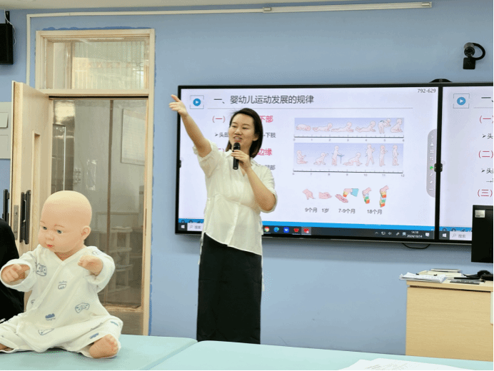 王老师将“关爱幼儿,责任担当,细心有爱”的核心理念贯穿整个教学过程。以饱满的热情和亲切的教态,为学生们传授了婴幼儿运动发展的专业知识与技能,充分展现了其深厚的专业素养和教学热情。通过线上线下混合式教学模式的巧妙运用,成功地将课前预习、课堂教学、学生讨论分享、实践活动组织、课后作业巩固及课程技能梳理等多个环节有机融合,打造了一堂生动有趣且富有成效的公开课。