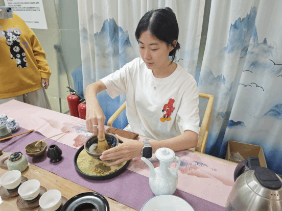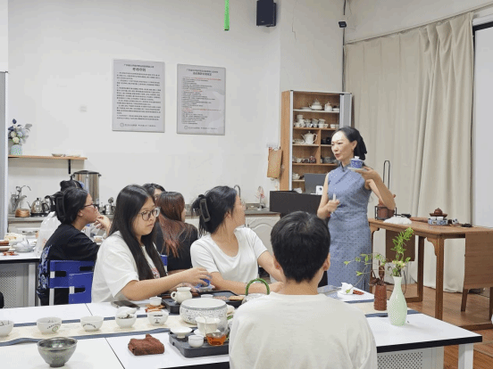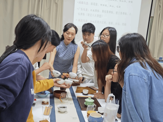 除了丰富的理论知识学习,讲座还安排了实践操作环节。在罗老师的指导下,学生们欣赏了宋代点茶的非遗技艺,亲身体验了冲泡潮汕功夫茶的流程。从选茶、备器、煮水、投茶到冲泡、奉茶,每一个步骤都充满了仪式感与艺术性。学生们在动手实践中不仅掌握了泡茶技巧,更深刻体会到了茶文化的独特魅力。从中国茶的起源到茶文化的繁荣发展,学生们仿佛穿越时空,亲历了一场茶文化的历史之旅。