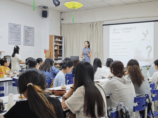 讲座围绕中国茶溯源、中国茶文化发展史、茶叶的基础知识和分类以及泡好一杯茶四个核心部分展开。罗方老师以其深厚的理论知识和丰富的实践经验,将中国茶文化的悠久历史与独特韵味娓娓道来,她特别强调了茶文化中的礼仪与哲学,如在讲解盖碗时,巧妙地将盖、碗、托分别比作天、人、地,寓意着茶道中“天地人和”的哲学思想。这一解读让学生们深刻感受到了中国茶文化中的智慧与和谐。