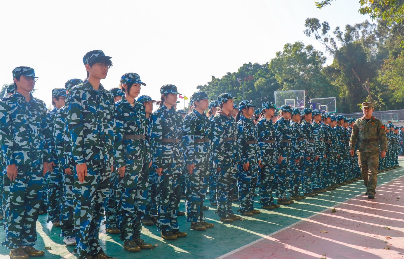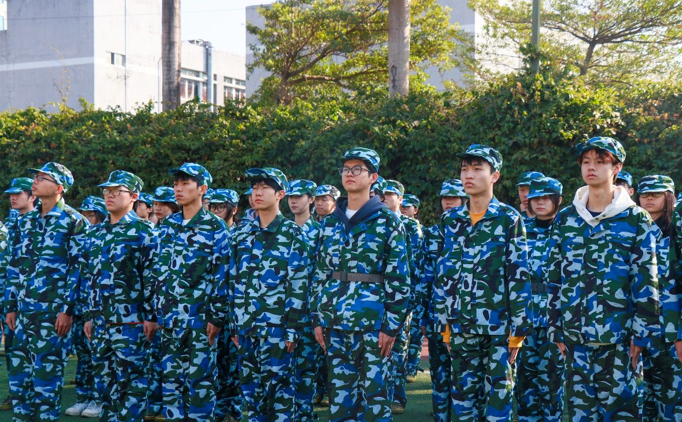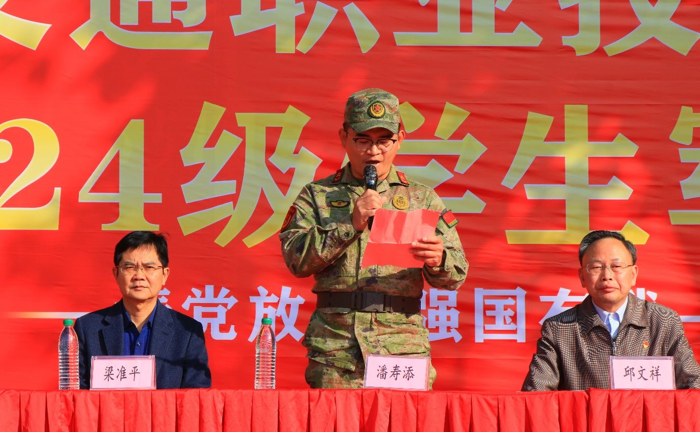 广州市天河区人民武装部潘寿添教官代表天河区人民武装部及全体承训教官对在座的学校领导、老师及参训的各位同学致以崇高的敬意,随后,他向同学们提出了四点期望:一是增强国防意识。增强组织纪律性。锻造吃苦耐劳、顽强拼搏的精神。二是树立爱国主义精神和集体主义精神。三是培养讲卫生、爱整齐、懂礼貌、讲文明的良好习惯。四是军训期间听指挥、学技能,交出满意答卷。