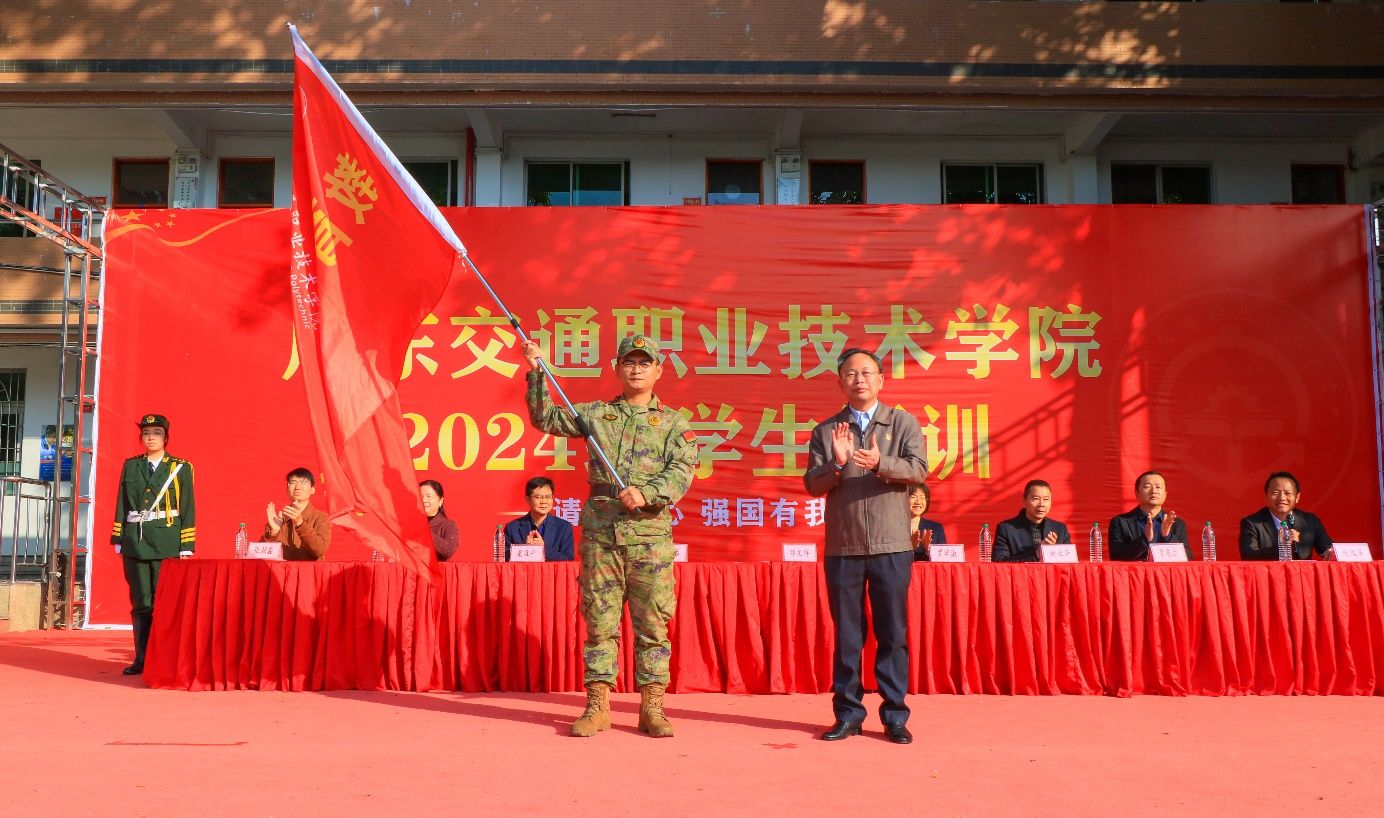 邱文祥向承训单位授旗。愿学子们在军训时全情投入、认真专注,以挺拔的身姿、坚定的步伐,彰显出广交青年昂然奋发的青春面貌,践行“求是、笃实、创新、立业”的校训精神。