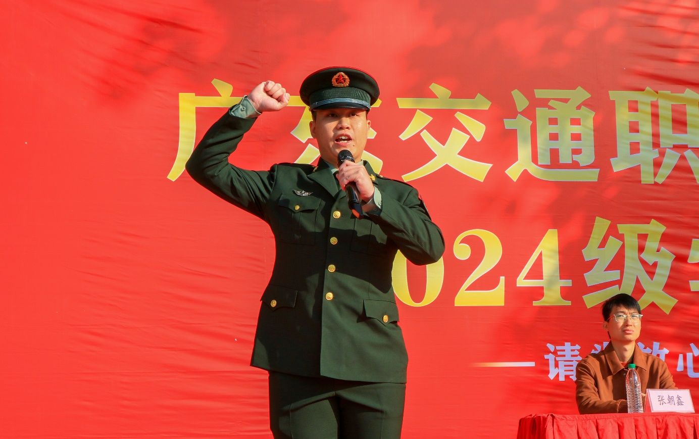 升国旗,那一抹鲜艳的红色在阳光下闪着。随着国歌奏响,旋律激昂回荡,2024级新生军训开营仪式正式开始。