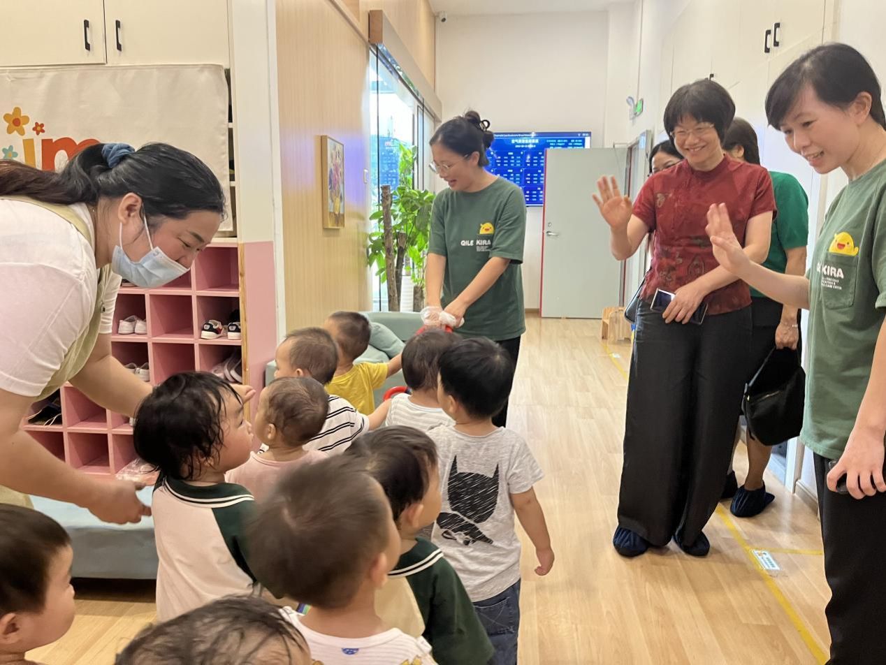 黄彩萍带领罗罕淑一行参观园区和各功能室,并介绍了园区各班级的特点和园区的照护与教育的理念。