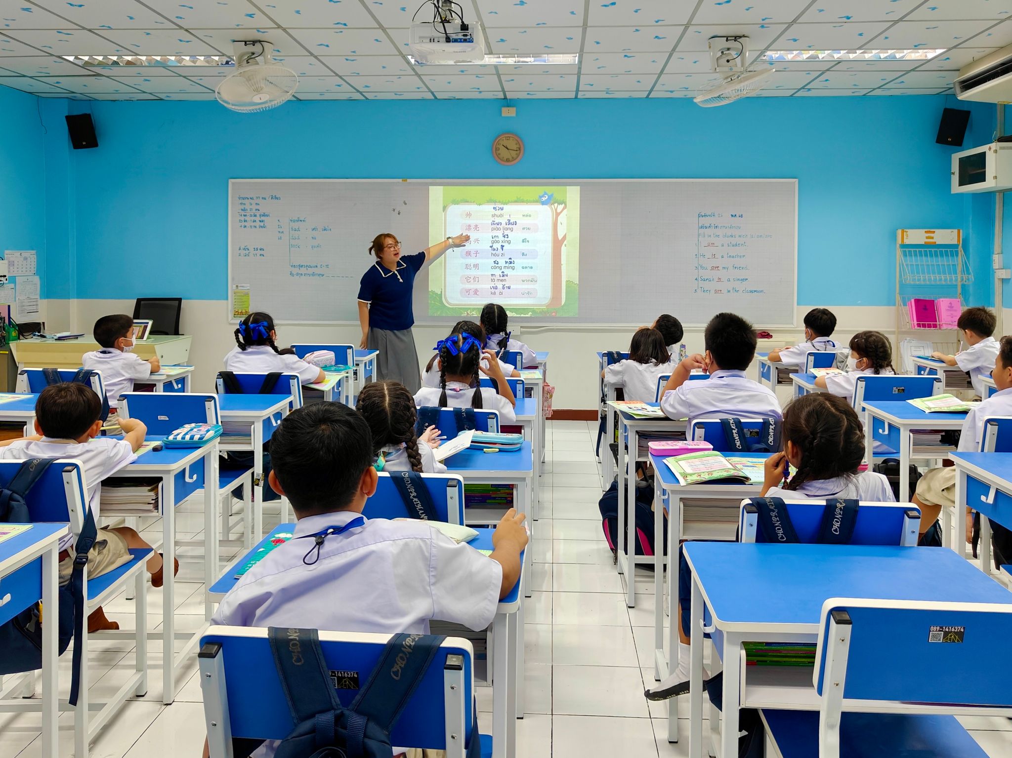 5月26日,在熟悉了教学和生活环境,了解了基本教学活动开展流程及泰国学校相关管理规定后,实习生正式开启教学第一课。针对3-17岁不同学段学生特点,团队创新教学方法:幼儿园课堂通过绘画游戏、肢体语言突破语言障碍;小学阶段设计拼音儿歌、词汇卡片等趣味课程;高中课堂融合中华文化与才艺教学。在带队老师指导下,实习生逐步掌握跨文化课堂管理技巧,泰方师生评价实习生教学“兼具创新性与实用性”。