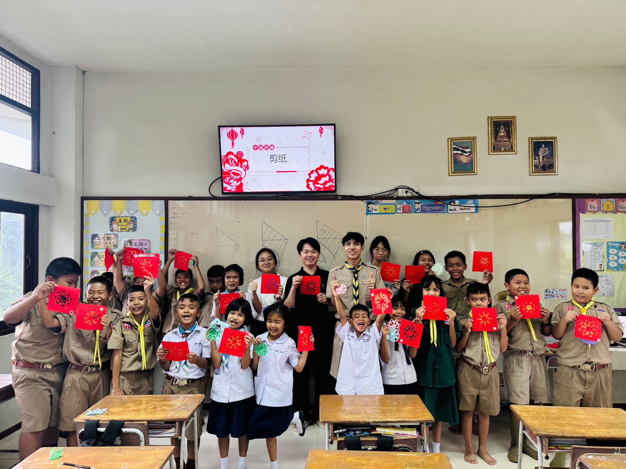 依托学院“中文+中华才艺技能”项目,师生团队开展一系列文化实践活动:剪纸课上,泰国学生剪出吉祥团花;拓印与水墨吹画课堂展现汉字与东方美学魅力;京剧脸谱绘制中,生旦净末丑的故事引发热烈讨论;中国结制作传递“以结寄情”的祝福。端午期间,师生策划“画粽子”“制扇面”等主题活动,暖武里府学生用五彩画笔描绘粽子表情,尖竹汶府课堂通过视频与手工体验让端午文化“活起来”。同时,团队参与泰国拜师节跪拜礼、寺庙文化体验等活动,丰富中泰文化交流。